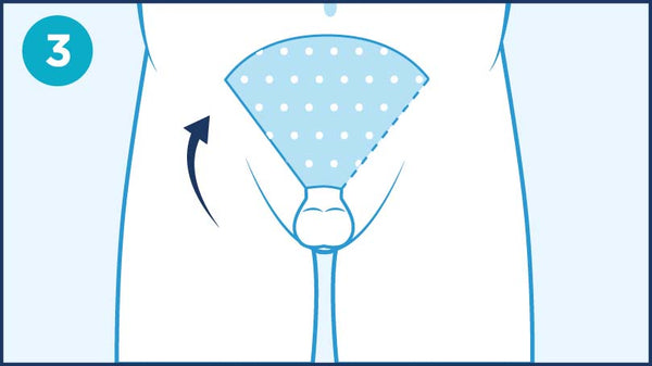 Fold pointed flap over penis at 45 degrees, then fold straight flap over, slightly pulling upwards.